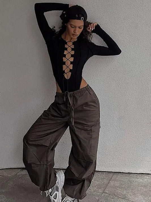 Long Sleeve Black Solid Hollow Out Bandage Top