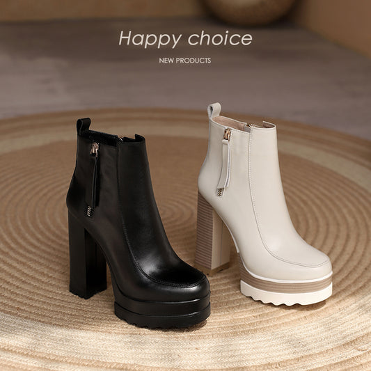 Women's Chunky Heel Platform Leather Side Zip Square Toe Ankle Boots