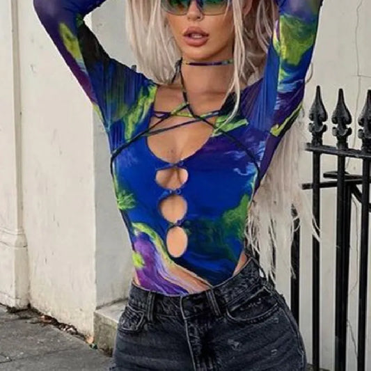 Sexy Deep V-neck Bandage Long Sleeve Bodysuit