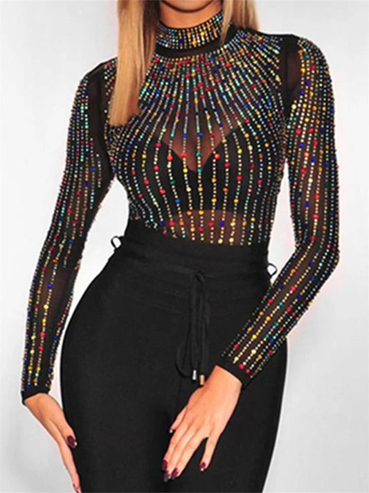 Women Sheer Rhinestone Long Sleeves Bodysuit