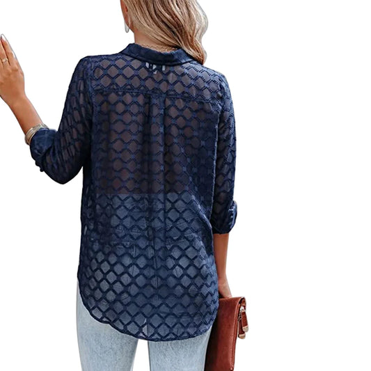Women's Long Sleeve V Neck Mesh Sheer Blouse